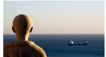 observant el mar i els moderns vaixells de càrrega, que en el seu port
