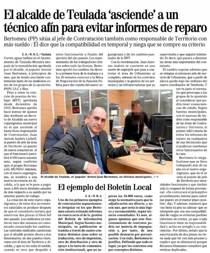 Duro titular el que le dedica El Mundo en su edición escrita de hoy al alcalde de nuestro municipio que dice así: "El alcalde de Teulada "asciende" a un técnico afín para evitar informes de reparo".