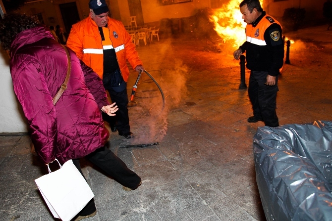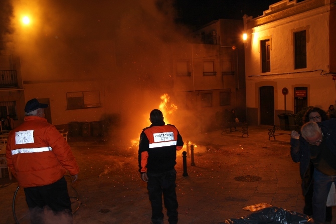 Tan solo los miembros de Protección Civil en el lugar, se ocuparon durante los primeros instantes del sobresalto que se produjo tras la detonación. De hecho uno de los efectivos que estaban con una manguera refrescando la zona, recibía un impacto -tras la explosión- de un fragmento de madera aún en llamas, eso sí, sin consecuencia alguna.