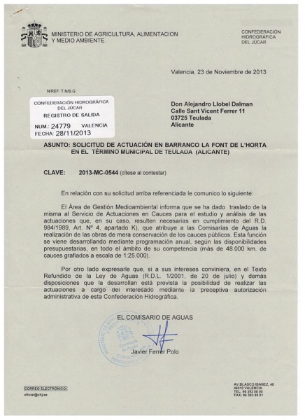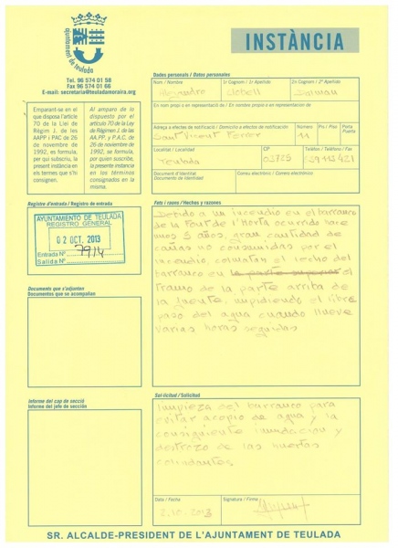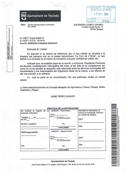 Para muestra de la argumentado, vean una situación digna de Kafka consecuencia de mi solicitud cursada mediante Instancia al Ayuntamiento reclamando la limpieza del lamentable estado de suciedad del barranco de la Font de l'Horta .
