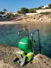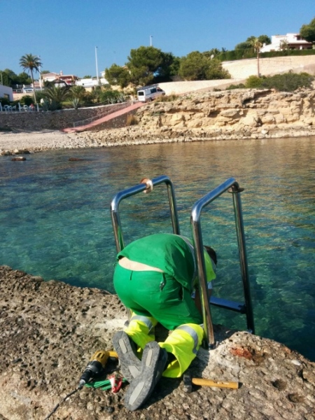 La Concejalía de Servicios Generales del Ayuntamiento de Teulada ha reparado la escalera de acceso para bañistas de la playa de l´Andragó. La escalera se repuso tan solo 24 horas después de que se hubiera arrancado el anclaje tras el temporal sufrido estos días anteriores.