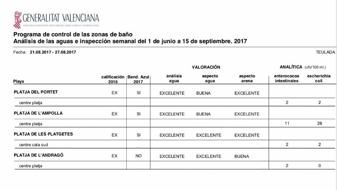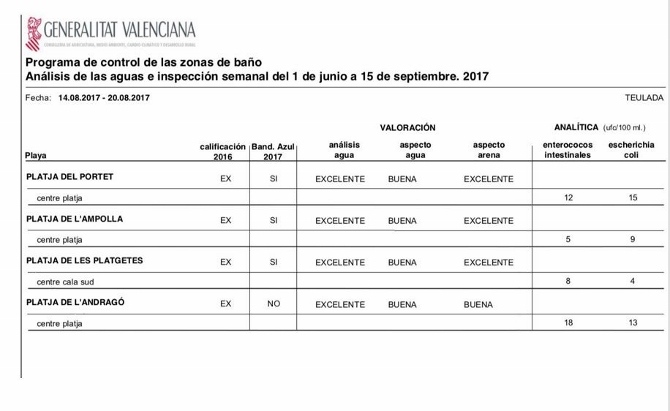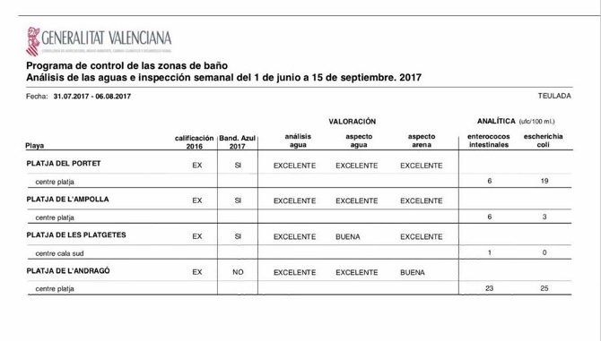 En los análisis de las aguas e inspecciones semanales realizadas desde el 1 de junio, la Generalitat valora como excelente la calidad del agua de las cuatro playas del municipio y como buena/excelente el aspecto de la arena.
