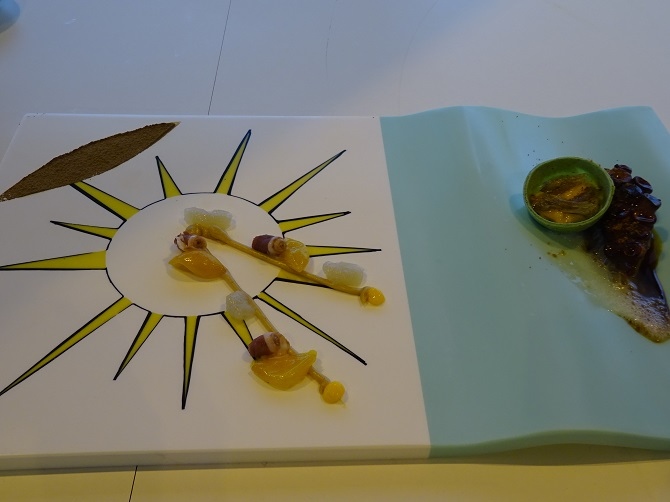 Un concepto gastronómico que Alonso ha creado sobre un soporte muy especial diseñado para la ocasión que representa una parte el vaivén de las olas del mar y la otra los rayos del sol, realizado con el material Krion Solid Surface de Porcelanosa, que ha ido componiendo a través de diferentes productos del sol, como la almendra, los cítricos, gnoquis de moscatel con pato a la brasa de viña, tierra de algarroba y aceite esencial de pino marino, y de mar, con el pulpo, las algas, sal de mojama y agua de mar.