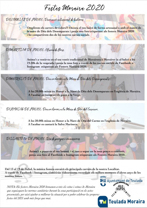 El Ayuntamiento de Teulada Moraira y la Comisión de Fiestas San Vicente Ferrer 2020 han decidido la suspensión de las fiestas de este año ante la crisis sanitaria. Las celebraciones, que tradicionalmente son tras la Semana Santa, se habían aplazado a un fecha que estaba por decidir, pero una vez estudiada la situación y en vista de la evolución de la misma, se ha determinado que no haya fiestas hasta 2021.