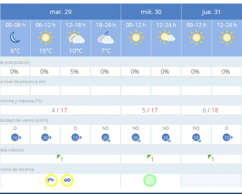 Las temperaturas mínimas se situarán en 7 grados, mientras que la máxima podría rondar los 20 grados. Para el viernes la previsión apunta a un incremento de las temperaturas con una máxima que sitúa en 22 grados y sitúa la probabilidad de lluvia en el 85%.