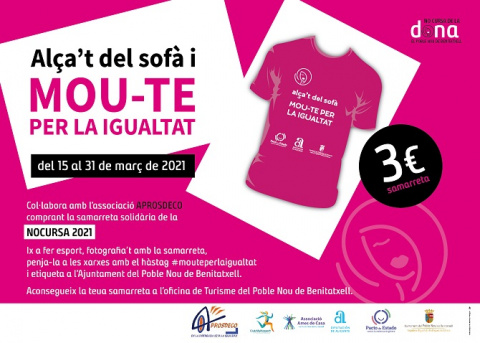 Pero la acción continúa. Del 15 al 31 de marzo, la Concejalía de Igualdad y la Asociación Mujeres proponen la actividad ‘Muévete por la igualdad’, que invita a colaborar con la asociación Aprosdeco comprando, a un precio de 3 euros, la camiseta solidaria de la ‘no-cursa 2021’, saliendo a hacer deporte, fotografiándose con la camiseta y colgándola en las redes sociales con el hastag #mouteperlaigualtat. La camiseta se puede adquirir en la oficina de Turismo (Calle Mercado, 1). La recaudación irá destinada íntegramente a Aprosdeco.