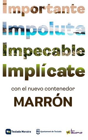 El Ayuntamiento de Teulada y Teumo lanzan una nueva campaña para concienciar del reciclaje de residuos orgánicos. Por ello, bajo el lema “IMPORTANTE, IMPOLUTA, IMPECABLE, IMPLÍCATE”, se han habilitado 21 contenedores marrones en Teulada Moraira para reciclar residuos orgánicos.