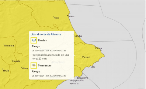 La Agencia Estatal de Meteorología ha activado la alerta amarilla por fuertes lluvias en la Marina Alta para todo este domingo 23 de mayo.