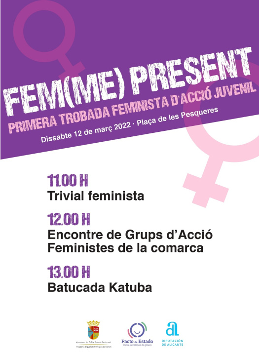 Este encuentro será el sábado 12 de marzo en la carpa de la plaza de las Pesqueres. Se iniciará a las 11:00h con un trivial feminista. A continuación, a las 12:00h, está programado el acto central: el encuentro de grupos de acción feminista de toda la comarca. Y a las 13:00h, para cerrar la jornada, actuará la batucada Katuba.
