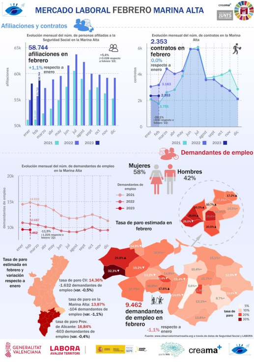 La Marina Alta experimenta un crecimiento en el empleo en febrero 2023, con 628 nuevos ocupados y 104 demandantes de empleo menos, marcando el mejor febrero de la serie histórica. El número de afiliados a la Seguridad Social se sitúa en 58.744, un aumento del 1,08% respecto al mes anterior.