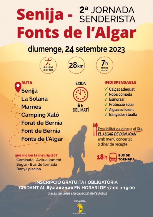 El punto de partida está programado para las 6 de la mañana desde Senija, y la vuelta en autobús está prevista para las 18 horas del mismo día. La ruta planificada seguirá los siguientes puntos: Senija - La Solana - Marnes - Camping Xaló - Forat de Bernia - Font de Bernia - Fons de l'Algar.