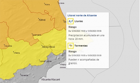 Según la Agencia Estatal de Meteorología, el decreto de este aviso entrará en vigor a partir de esta medianoche y se mantendrá hasta las 14h de mañana. Se espera un riesgo importante de lluvias en la comarca que podría dejar acumulados de hasta 40 litros de agua. A su vez, está decretado el aviso amarillo a partir de mediodía y hasta la medianoche del sábado 16 por lluvias y el aviso amarillo por tormentas durante toda la jornada.