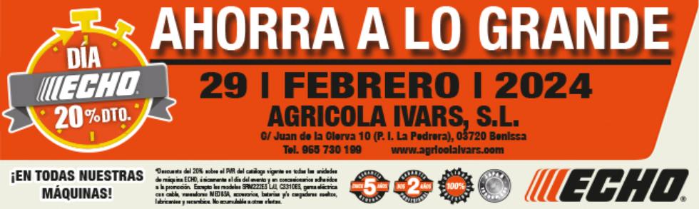 Los entusiastas de la jardinería y la agricultura están de enhorabuena. Agrícola Ivars, S.L. ubicada en el Polígono Industrial de Benissa ha anunciado una promoción única: el Día ECHO, que se celebrará este 29 de febrero de 2024, ofreciendo un generoso descuento del 20% en toda su gama de maquinaria.