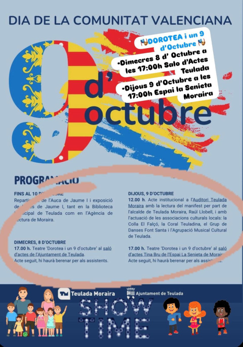 El miércoles 8 de octubre, a las 17:00 horas, se representará la obra de teatro “Doroeta i un 9 d’octubre” en la Plaça de la Constitució. Al finalizar, se ofrecerá un berenar a los asistentes.