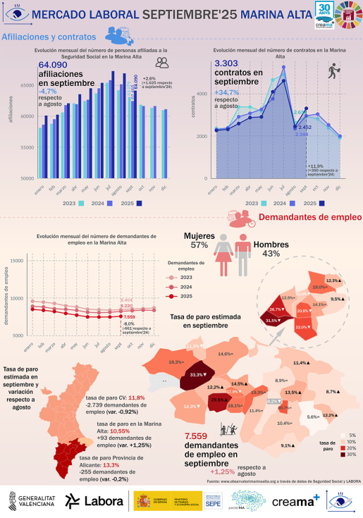 El mercado laboral de la Marina Alta ha cerrado septiembre con los ajustes habituales del final del verano, pero también con señales claras de fortaleza estructural. Aunque la afiliación a la Seguridad Social se redujo en 2.819 personas y el paro aumentó ligeramente en 93 personas, los datos confirman que la comarca avanza hacia un modelo laboral más estable y diversificado.