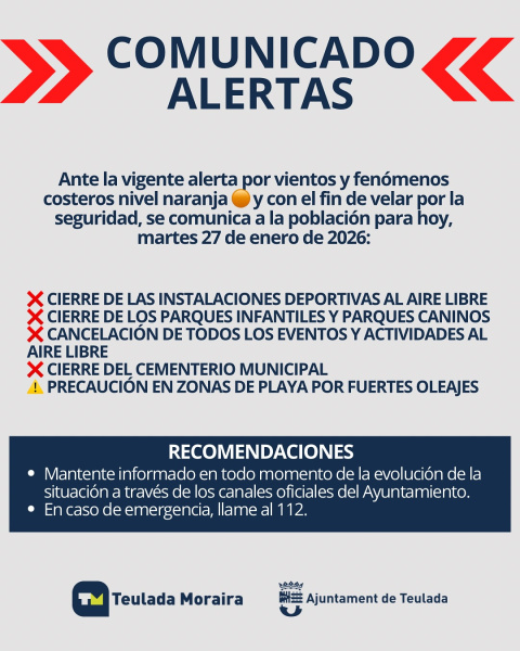 El municipio de Teulada Moraira se encuentra este domingo 4 de enero de 2026 bajo alerta meteorológica nivel naranja por lluvias, dentro del aviso decretado para el litoral norte de la provincia de Alicante, según ha informado el Centro de Coordinación de Emergencias de la Generalitat Valenciana, a partir de la predicción de la Agencia Estatal de Meteorología.