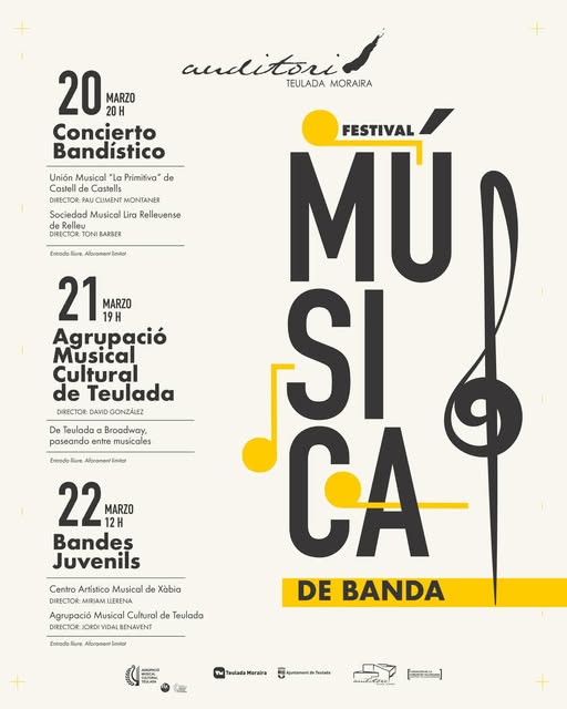 El sábado 21 de marzo, a las 19:00 horas, será el turno de la Agrupació Musical Cultural de Teulada, que ofrecerá un concierto temático bajo el título “De Teulada a Broadway, paseando entre musicales”, un recorrido por algunas de las melodías más reconocidas del género.