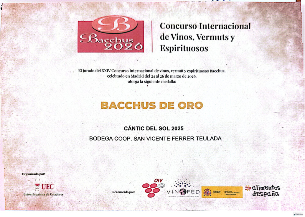 La bodega cooperativa San Vicente Ferrer de Teulada ha sido reconocida nuevamente en el ámbito internacional tras obtener una Medalla de Oro en el prestigioso certamen Bacchus 2026, uno de los concursos más relevantes del sector vitivinícola a nivel mundial.