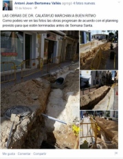 Tiempo después, concretamente el 10 de febrero del presente año, en el muro personal del primer edil, Bertomeu se jactaba de que las obras marchaban a buen ritmo y que estaría acabadas antes de Semana Santa.