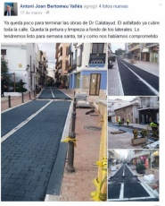 Un mensaje similar, es repetido el 17 de marzo donde literalmente el munícipe afirmaba: "Ya queda poco para terminar las obras de Dr Calatayud. El asfaltado ya cubre toda la calle. Queda la pintura y limpieza a fondo de los laterales. Lo tendremos listo para semana santa, tal y como nos habíamos comprometido".