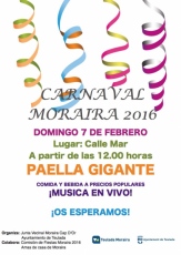 Como colofón final de la semana de carnavales, el domingo en la Calle del Mar de Moraira se realizará una paella gigante, organizada por la Junta Vecinal Cap d´Or y la colaboración de la Comisión de Fiestas de Moraira. La comida irá acompañada de música en vivo.