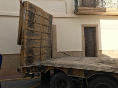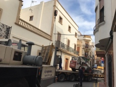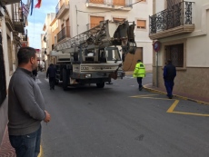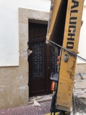 La maniobra del tráiler ha dañado la fachada de una vivienda y una grúa está en estos momentos realizando las maniobrar con el fin de normalizar la situación.