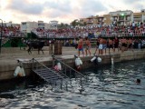 Los negocios bajaron sus persianas ante el ruido del cohete que anunciaba la salida de los toros, mientras cientos de corredores realizaban la carrera de su vida, hasta la plaza que está situada en el puerto.