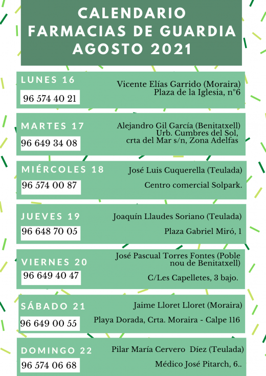 Calendario de las farmacias de guardia del 16 al 22 de agosto en Teulada Moraira Leer más...